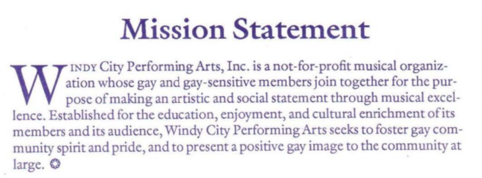 Windy City Gay Chorus has received substantial recognition from the choral industry and government sources, including current grants from the National Endowment for the Arts, the Illinois Arts Council, and the City of Chicago Office of Fine Arts. The ensemble has been lauded in proclamations by the Illinois House of Representatives and the mayors of Denver, Minneapolis, Saint Paul, and Washington, D.C., as well as by Chicago’s late Mayor Harold Washington. In his proclamation, Mayor Washington hailed the group as “a unique asset to the cultural life of the city and a source of pride to its citizens, who are devoted to excellence in the performing arts.”