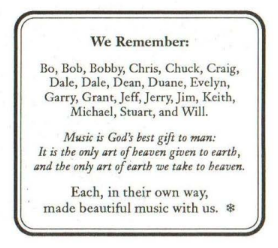 This holiday season reminds us of our blessings-our talented Artistic Director, our cadre of volunteers (without whom so very much would be left undone), our singers who toil unbelievably hard every week to bring you the joy of our music, our program advertisers and in-kind contributors (Please patronize them, and let them know your appreciation), our donors who selflessly give because they believe we make a difference in the quality of life, and every one of you who rewards us with recognition and appreciation.