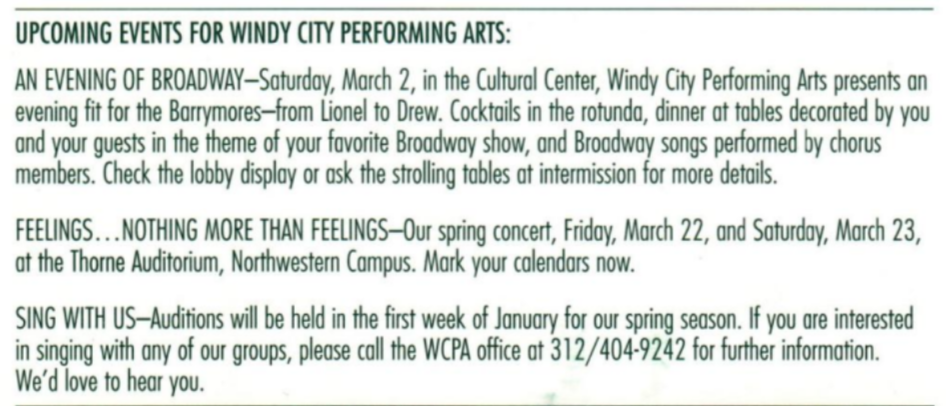 Since its inception, Windy City Slickers has brought its own brand of spicy musical wit to the Chicago area. This ensemble, under the direction of Eric Lane Barnes, is available to perform for private functions. Call the Windy City Office at 312/404-9242 for details.