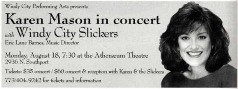 Since its inception, Windy City Slickers has brought its own brand of spicy musical wit to the Chicago area. This ensemble, under the direction of Eric Lane Barnes, will be performing August 18th with Chicago favorite Karen Mason in a benefit for Windy City Performing Arts. Slickers is also available to perform for private functions. Call 773/404-9242 for details on the Karen Mason evening or to find out how to have Slickers perform at your event.