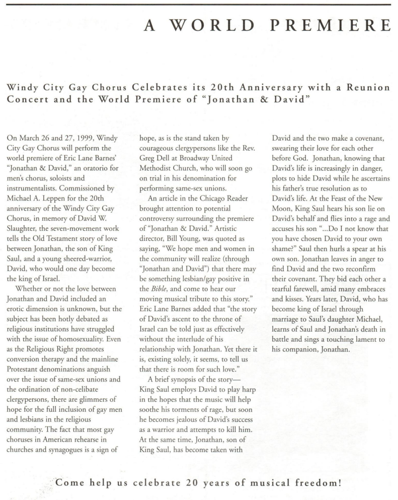 On March 26 and 27, 1999, Windy City Gay Chorus will perform the world premiere of Eric Lane Barnes’ “Jonathan & David,” an oratorio for men’s chorus, soloists and instrumentalists. Commissioned by Michael A. Leppen for the 20th anniversary of the Windy City Gay Chorus, in memory of David W Slaughter, the seven-movement work tells the Old Testament story of love between Jonathan, the son of King Saul, and a young shepherd-warrior, David, who would one day become the king of Israel.