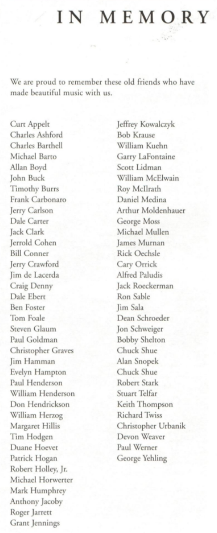 On November 17, 1993, Richard Garrin was chosen for induction into the Chicago Gay and Lesbian Hall Of Fame. WCGC presented an encore performance of Hidden Legacies, performed at Northern Illinois University and Western Illinois University, and presented the premiere of the commissioned work Letters To The Future by Roger Bourland. This would be Richard Garrin’s last season with WCPA.