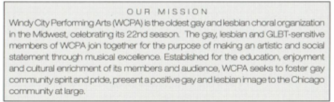 WCGC, formed in 1979, is one of the oldest Gay choruses in the United States and is a founding member of the Gay & Lesbian Association of Choruses. In 1982, they became the only openly gay chorus to ever win first place in the highly regarded Johnny Mann Great American Choral Festival, and in 1996 appeared in the Steppenwolf production of “Everyman”. The chorus has recorded three CDs, including “Legacy”, celebrating 20 years of song.