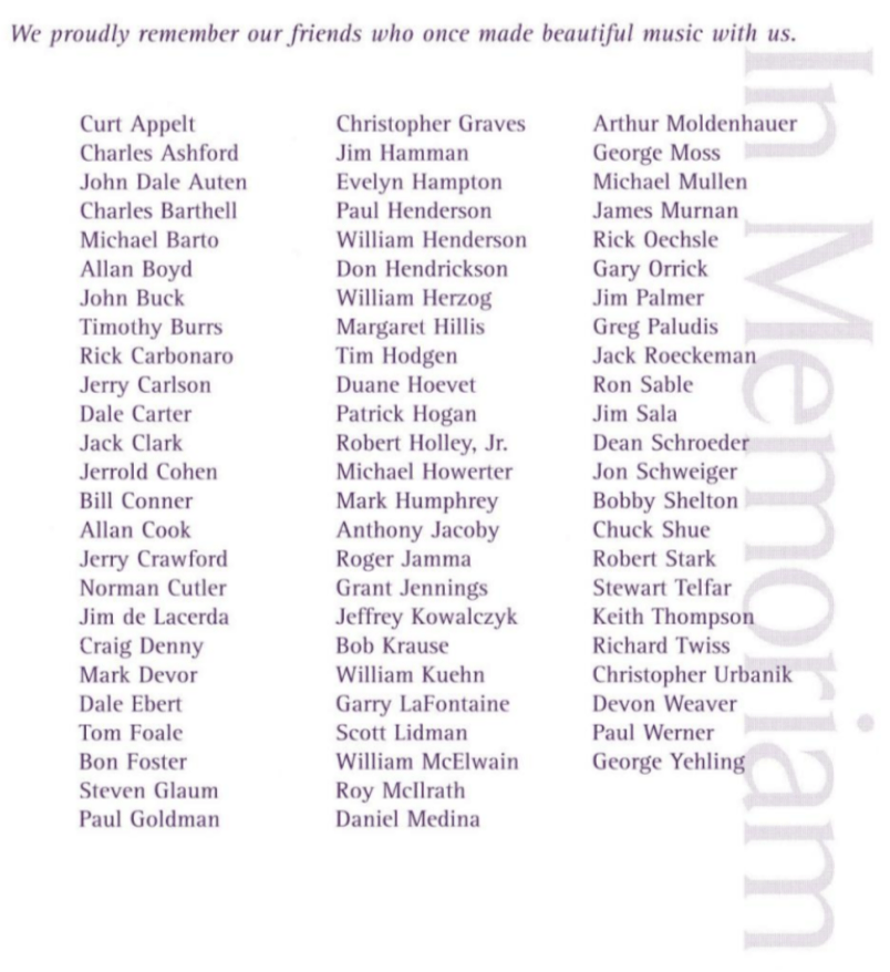 In addition, this weekend we help the Chicago GLBT community celebrate our Pride. To begin this annual celebration, our program reflects the love, the struggle, the fun, the challenges, and ultimately the unity that we continue to strive for. We hope our music here tonight will kick-off what will be a fun, memorable, and energizing Pride Celebration Week 2002.