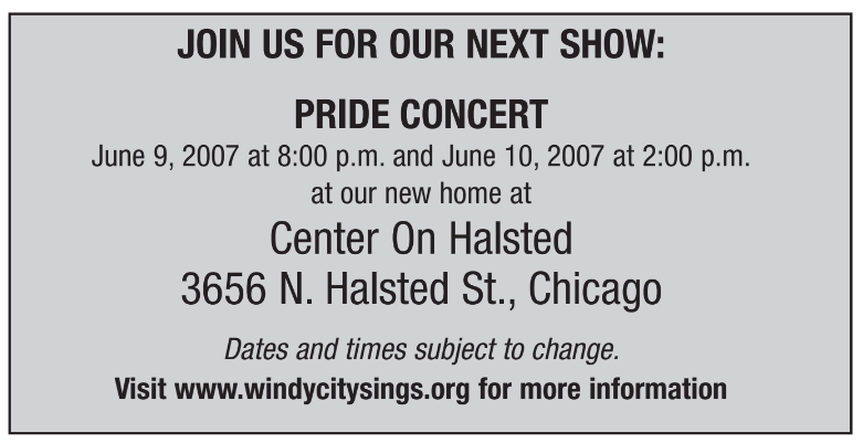 Founded in October, 1979, Windy City Gay Chorus is the oldest Gay chorus in Illinois and the Midwest, and one of the first gay choruses organized in the country. WCGC is a founding member of the Gay and Lesbian Association of Choruses (GALA). WCGC’s first performance was in December of 1979, at the “Don We Now” holiday concert at Stages Music Hall. Windy City Gay Chorus has performed in cities throughout the country, and has been lauded by the Illinois House of Representatives, the mayors of Minneapolis-St. Paul, Denver, Washington, D.C., San Francisco, Seattle and Chicago mayors Richard M. Daley and the late Harold Washington. The chorus believes in reaching out to support Chicago’s GLBT community and the community at-large by participating in events that bring enjoyment and pride to audiences and members alike.