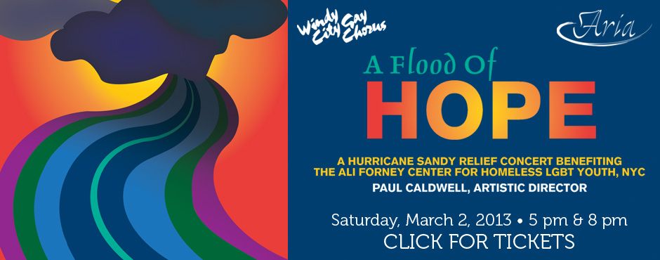 A concert of hope, survival, and support filled with emotionally moving songs about wind, sea, and rain. Join Windy City Gay Chorus and Aria as we present “A Flood of Hope”, a Hurricane Sandy Relief concert benefiting the Ali Forney Center in New York City for homeless LGBT youth that was destroyed in last fall’s devastating storm on the east coast.