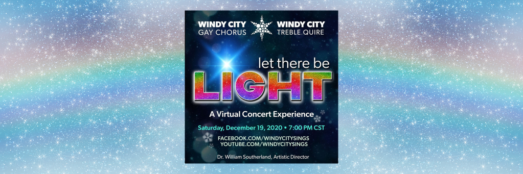 Windy City Gay Chorus & Windy City Treble Quire invite you to join us from the comfort of your own living room for our holiday concert, “Let There Be Light: A Virtual Concert Experience”. We’ll feature a jolly blend of fresh, new, beautiful songs presented by our choruses and soloists that will move, embrace, and lift your spirits. We hope to brighten your night with some Windy City holiday light!