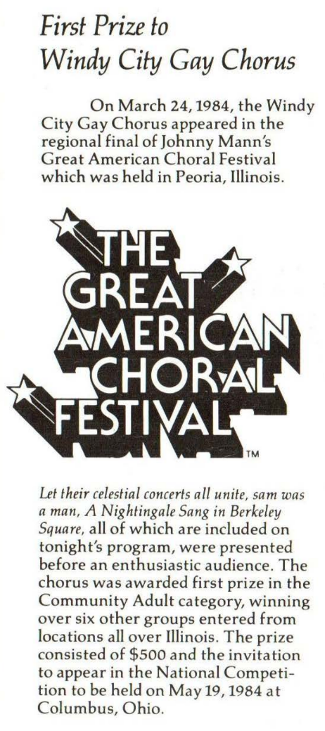 The Chorus’s visibility beyond Chicago’s gay community is also increasing. It has sung at the Century Shopping Mall, and members performed at Yul Brynner’s 50th Anniversary Party at Arie Crown Theatre last year. The Chorus has given concerts at downtown theaters, at Mandel Hall (University of Chicago) and at several northside locations. Each year the Chorus goes on tour: Milwaukee in 1981, New York in 1982 and Indianapolis in July, 1983. The Chorus will rejoin the Twin Cities Men’s Chorus at Minneapolis’s Orchestra Hall in April, 1984. The Chorus has already received a mayoral proclamation from both St. Paul and Minneapolis in support of this concert. Plans also include a debut at Chicago’s Orchestra Hall, participation in the ’86 National Choral Festival, more commissions of original works for male chorus, guest artists and a European tour in 1987.